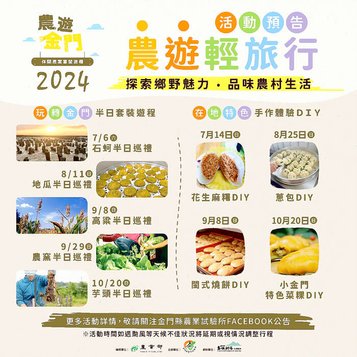農試所也指出,自暑假起精心設計一系列單點及套裝半日遊程,帶領大家深度遊覽、體驗、遊歷金門的農村景致,了解當地農林漁牧業的發展與歷史,親身體驗金門獨特的食材與美食文化,在製作美味佳餚的同時,更深入了解金門的傳統與特色。