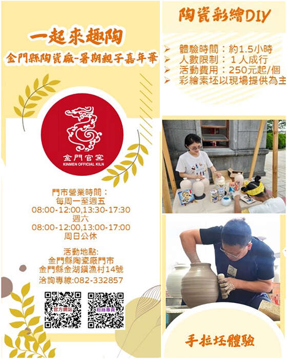 金門縣陶瓷廠在今年暑假推出「一起來趣陶」,誠摯邀請各家庭參加,共享一場充滿創意和樂趣的陶瓷體驗之旅,有一個充實難忘的暑假。報名網址為https://reurl.cc/AjYL9K,陶瓷廠指出,名額有限,且暑假期間遊客眾多,有意參加者請及早(課前3天)預約。如需了解更多活動詳情或預約參加,報名專線:082-332857。