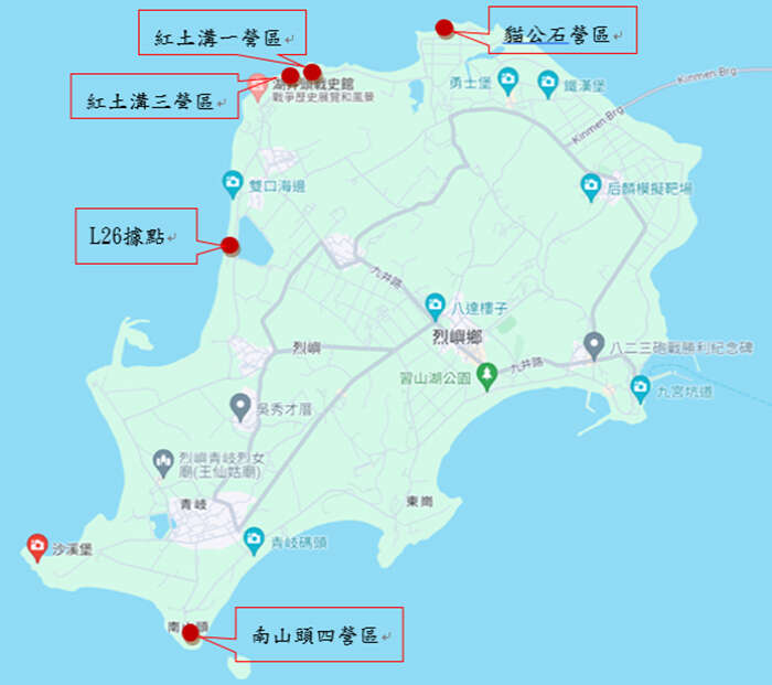 金管處表示,烈嶼守備大隊將在十九日至二十七日演習,使用L13(南山頭四營區)、L26、L34(紅土溝三營區)、L36(紅土溝一營區)及L43(貓公石營區)等五處據點,因此暫停開放。
