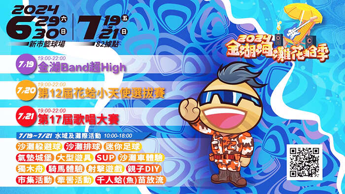 金湖鎮公所表示,為期三天活動的海灘花蛤季除在晚間有美好的音樂及視覺享受外,白天從上午10點開始,歡迎民眾來到海邊水樂園,繽紛的水上與灘際活動,讓大家在炎熱的夏天感受到清涼的體驗,現場設有氣墊城堡為小朋友們提供了安全又有趣的遊玩空間,還有免費體驗拍攝3D立體照和大型沙雕展,尤其今年又增設7組小朋友與家長們最能聯繫感情的無動力遊憩設施,不僅僅如此,沙灘牽罟、沙灘排球、沙灘躲避球和沙灘足球等多項活動,讓大家能夠在沙灘上盡情揮灑活力。
