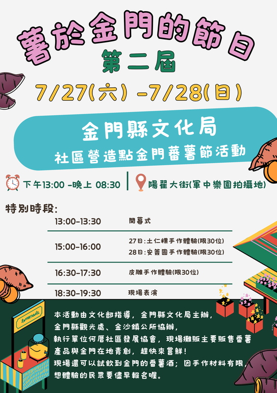 何厝社區發展協會,訂於113年7月27日起一連兩日假陽翟大街舉辦「薯於金門的節日-金門蕃薯節」活動,現場規劃有市集和多項手作體驗,以及蕃薯產品試吃、蕃薯酒試飲等。歡迎鄉親、遊客踴躍到場參與,共享這場蕃薯的盛宴。