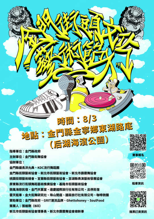 這場「金門街頭文化藝術節」是由金門縣街舞協會理事長李依文與新北市街頭藝術協會理事長張維剛攜手金門縣政府觀光處,並在議長洪允典的大力支持下共同舉辦的,活動時間為八月三日的下午一時起至晚間八時,地點在后湖海濱公園隆重登場。