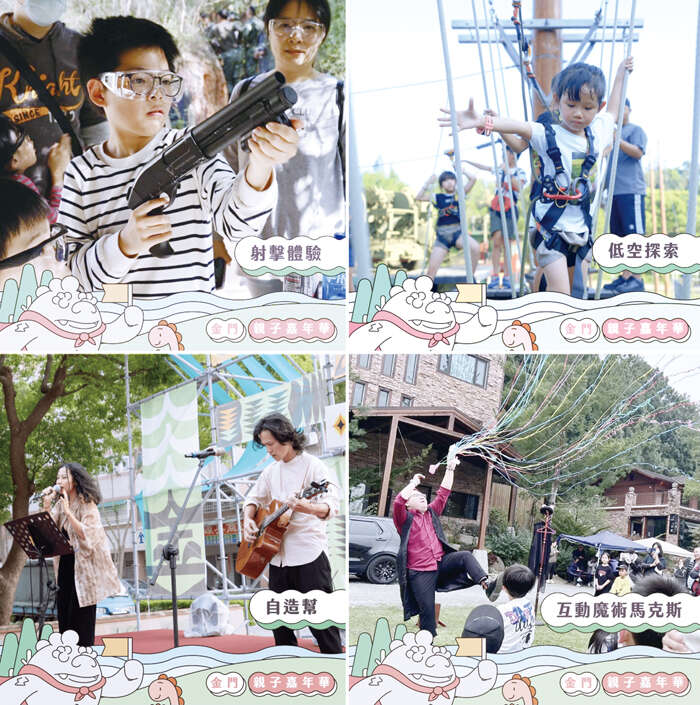 另同時預告,因凱米颱風順延的「2024金門親子嘉年華活動」主活動日,配合表演團體檔期順延調整至8月31日、9月1日在金湖綜合體育館舉辦,除了壓軸邀請到大、小朋友們喜愛的超級偶像「巧虎」來到金門開啟「巧虎歡樂派對」外,還有「旋舞炎火光焰舞」、「KDC小MiniKo」、「大小丑氣球派對」、「小丑氣球雜耍秀」、「夢幻泡泡秀」、「神奇舞台魔術秀」、「歡樂汽球人」、「觀光小天使阿特帶動跳」、「銀河谷音劇團」、「泡泡哥哥」、「中國戲法&川劇變臉」等節目輪番上陣,活動現場遊樂設施特別設計金門從未出現過的「超大型跑酷島」,以9座叢林柱、甜甜圈、攀岩等多樣闖關關卡,讓小朋友盡情FUN電玩樂;玩累了現場還有各類商品市集提供大家悠閒漫遊。