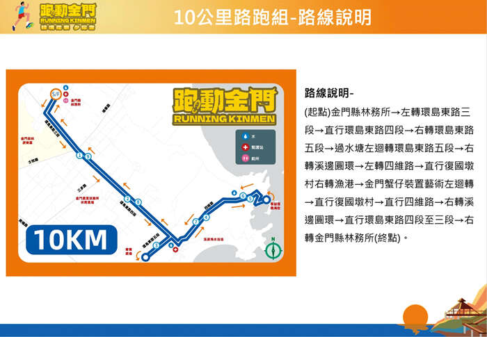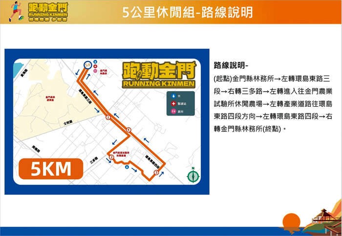 金湖分局表示,此次10公里於16時30分由林務所大門出發左轉環島東路3段-4段-5段,在溪邊舊海龍蛙兵訓練池塘段迴轉至溪邊圓環往復國墩漁港,再原路返回林務所結束比賽;另5公里於16時35分同樣由林務所大門出發左轉環島東路3段-4段右轉三多路-左轉農試所園區內道路,出農試所左轉環島東路返回林務所結束比賽(如附圖示)。