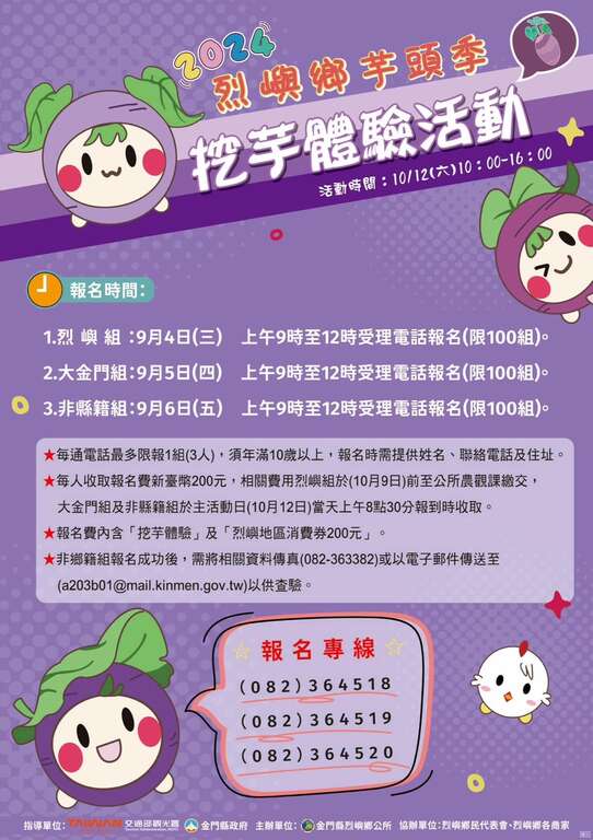 2024烈嶼鄉芋頭季活動訂於113年10月12~13日辦理開幕式活動,並於12日上午10時起至16時止辦理「挖芋體驗活動」,歡迎民眾及鄉親踴躍報名,烈嶼組鄉親受理報名時段為9月4日(三)上午9時至12時、大金門組民眾受理報名時段為9月5日(四)上午9時至12時、非金門縣籍組民眾受理報名時段為9月6日(五)上午9時至12時,額滿為止或報名時間截止。