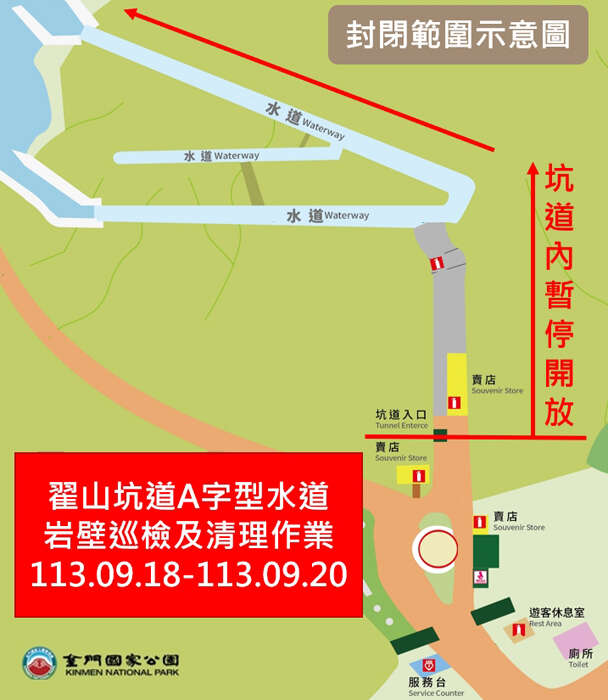 內政部國家公園署金門國家公園管理處表示,每年吸引眾多遊客造訪的翟山坑道,預定將在九月十八日(星期三)起至九月二十日(星期五)期間,辦理「坑道及A字型水道岩壁巡檢清理工作」,屆時坑道暨水道區域,將暫停對外開放。