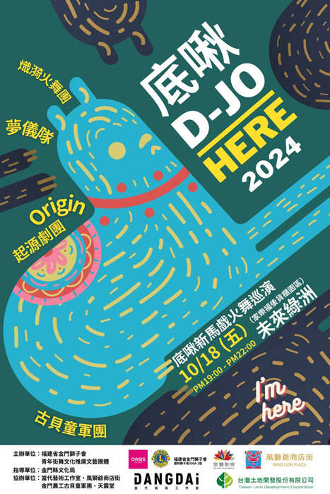 「底啾DJO—火舞儀隊藝術表演」是由金門縣文化局主辦,金門街舞表演文藝團體承辦,演出時間為十月十八日(星期五)的晚間七時起,在金門家樂福後方貨櫃園區OASIS未來綠洲盛大舉行。