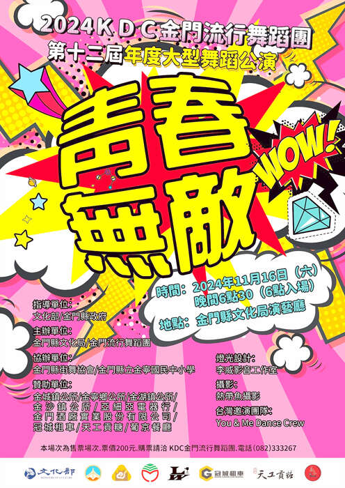 KDC金門流行舞蹈團大型舞蹈公演-青春無敵,11月16日晚間六時三十分起,在金門縣文化局演藝廳舉行。而該次公演為售票場次,門票售價200元,一人一票,憑票入場。