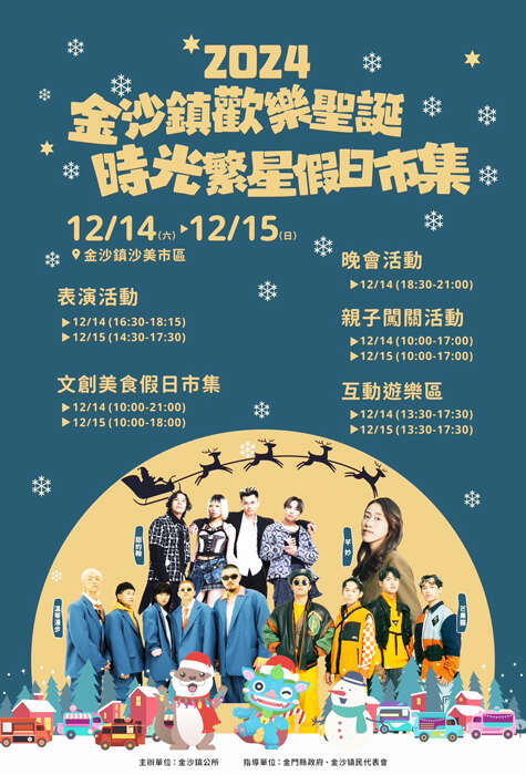 金沙鎮公所訂於12月14日、15日,沙美市區舉行「2024金沙鎮歡樂聖誕X時光繁星假日市集」一系列活動,連續兩日上午11時起可現場排隊體驗彩繪(每日100名),並有親子闖關換好禮(數量有限,換完為止)以及遊戲互動區等,活動亦邀台灣餐車,在地團隊及樂團芒果醬等多組藝人到場歡度佳節。12月14日晚間將點亮今年粉紅色系的8公尺高聖誕樹。金沙鎮鎮長吳有家歡迎鄉親到場參與精彩活動,一同感受歡樂又溫馨浪漫的聖誕氛圍。