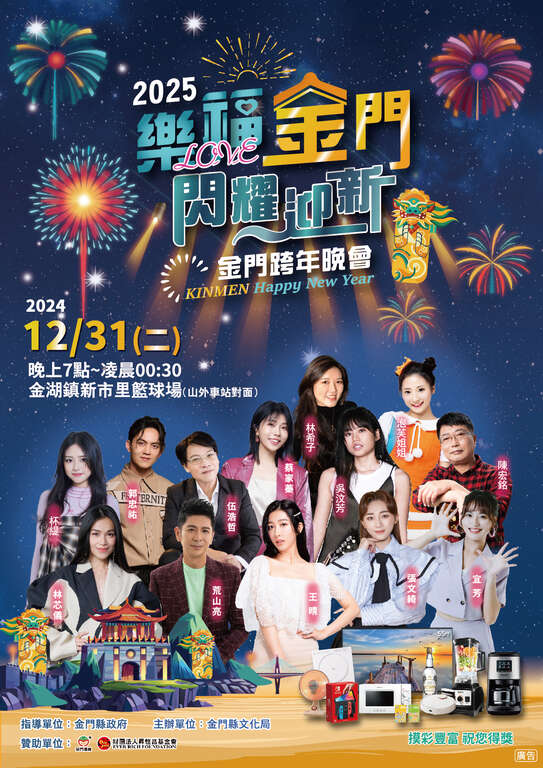 2025金門跨年晚會將於12月31日(週二)晚間7時在金湖鎮新市里籃球場(山外車站對面)熱鬧登場,包含多位藝人卡司,又有無人機群飛展演、跨年市集攤位,以及眾多好禮大獎摸彩,晚會內容相當精彩,主辦單位邀請民眾一同抓住2024年的尾聲,以歡笑與尖叫聲迎接新的一年。