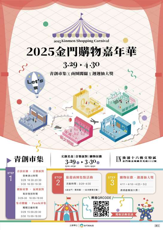 「2025金門購物嘉年華」將於3月29日登場!為期一個月的購物節,超過130家金門在地特色商家與青創品牌加入。特約商家將提供專屬購物優惠或滿額摸彩券,讓消費者在享受購物優惠的同時,也有機會抽中超過500項豐富好禮。縣府邀請大家在3月29日至4月30日期間踴躍參與「2025金門購物節」,享受購物樂趣的同時,也有機會把超值好禮帶回家!