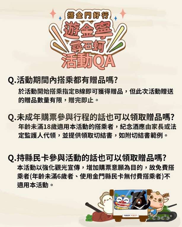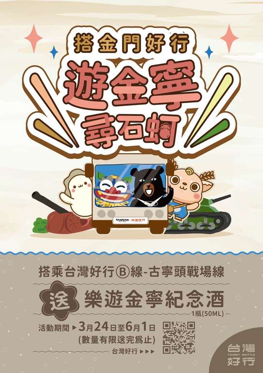 為鼓勵更多旅客搭乘台灣好行B線深入體驗金寧之美,凡於活動期間內(3月24日至6月1日)搭乘該路線並完成導覽,即可兌換「樂遊金寧紀念酒」一瓶。然而,因數量有限,贈品將以先到先得的方式發放。此外,根據活動規定,免費搭乘者(如未滿6歲兒童、使用金門縣民卡無付費者)不適用此活動,而未滿18歲的旅客則需由家長或法定監護人代領紀念酒。