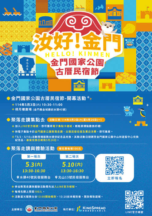 報名參加聚落走讀與體驗活動的旅客,每場次名額上限100人,需繳交新臺幣100元報名費。報名自114年4月7日中午12時開放,採線上報名制,有興趣的民眾可透過活動官網https://www.kingspread.com.tw/hellokinmen/或線上報名表單https://forms.gle/QbHocVCQu4wN1MwH8 或掃描QRCODE(如圖)報名。