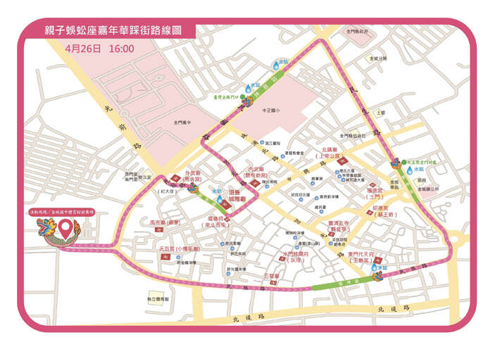 為一年一度的城隍爺繞境巡安活動進行暖身,「二○二五年金門迎城隍文化觀光季」已經在國曆的四月十二日登場,系列活動之一的「親子蜈蚣座嘉年華遊行」也預定將於四月二十六日(星期六)的下午一點三十分起至晚上八點為止,在金城鎮後浦城區舉行。為維護周邊道路順暢與遊行隊伍安全,金門縣警察局金城分局將進行周邊局部道路管制。