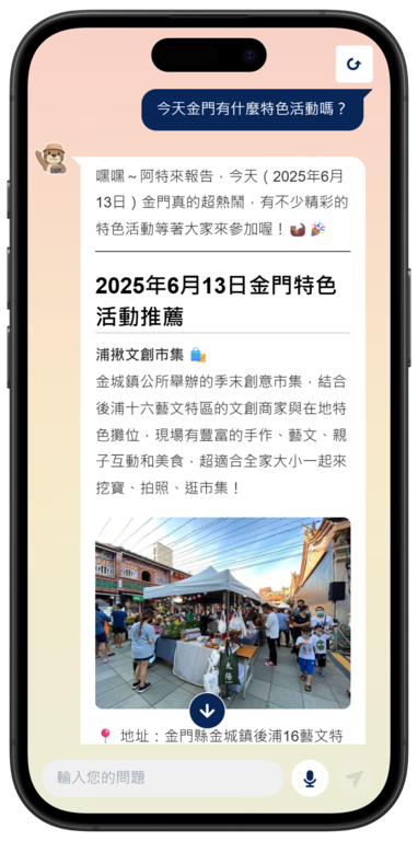 1. 「有活動都幫你顧,資訊不漏超清楚!」 — 阿特報馬仔上線!o 情境:剛下飛機,想知道「今天金門有什麼特色活動嗎?」