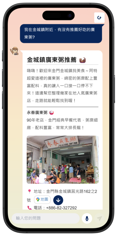 這次新推出的「阿特AI智慧客服」,結合OpenAI、Gemini、Perplexity、Claude 等多個大型語言模型與金門觀光旅遊資料庫,讓使用者能透過「阿特AI智慧客服」更快速取得金門旅遊相關資訊,獲得旅途中需要的協助。