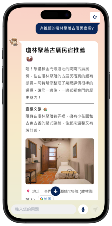 4. 「住宿需求說就好,想住古厝還是鬧區都找得到!」 — 阿特找房王o 情境:準備來金門過夜,想找「金城市區的飯店」或「瓊林聚落的古厝民宿」
