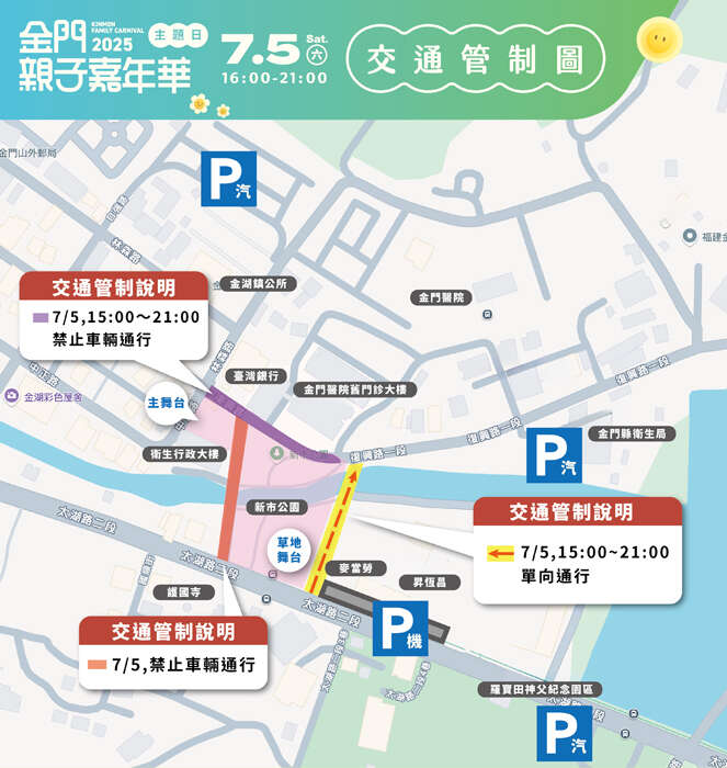 交通管制部分,自7月5日當日下午3時起,復興路(自臺灣銀行路口至金門醫院舊門診大樓右側路口)將全面禁止車輛通行,直至活動結束。此外,太湖路二段與復興路中間道路(護國寺至臺灣銀行路段)亦自7月4日上午7時起至7月6日上午7時止進行封閉。另麥當勞前至復興路段則自7月5日下午3時起調整為單向通行,請駕駛人務必提前規劃改道路線。