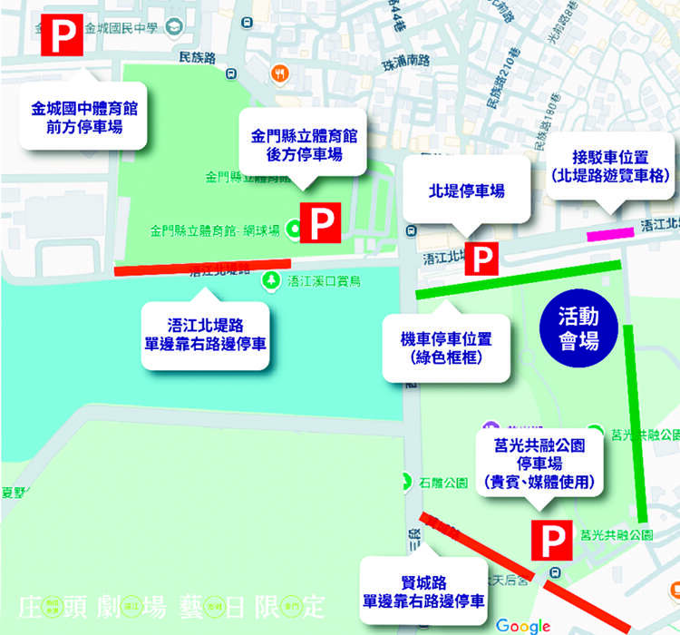 一、禁止進入及停放路段:活動當日,所有車輛(含汽、機車)禁止進入莒光湖畔共融公園遊戲場及會場內。浯江北堤路(不含大客車停車處)、西海路莒光橋至賢城路口路段,禁止任何車輛任意停放。
