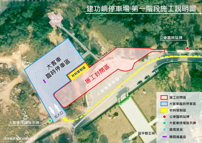 觀光處說明,「建功嶼停車場改善工程」從8月28日起開始施工,工程時間預計為一個月,採取兩階段施工:第一階段為進行大客車停車區施作,第二階段則會進行施作小客車停車區。