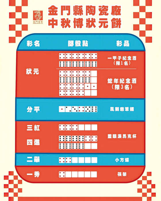 廠長林蔚尚特別準備了極具收藏價值的「金瓷一甲子紀念酒」作為狀元首獎,期望能吸引更多民眾前來參與。他表示,中秋博餅不僅是遊戲,更是蘊含著「共聚團圓、分享喜悅」的文化精神,陶瓷廠願意透過參與活動,與民眾共享這份節慶的喜悅,也藉此推廣金門在地陶瓷文創產業,讓更多人認識並喜愛金門的特色商品。