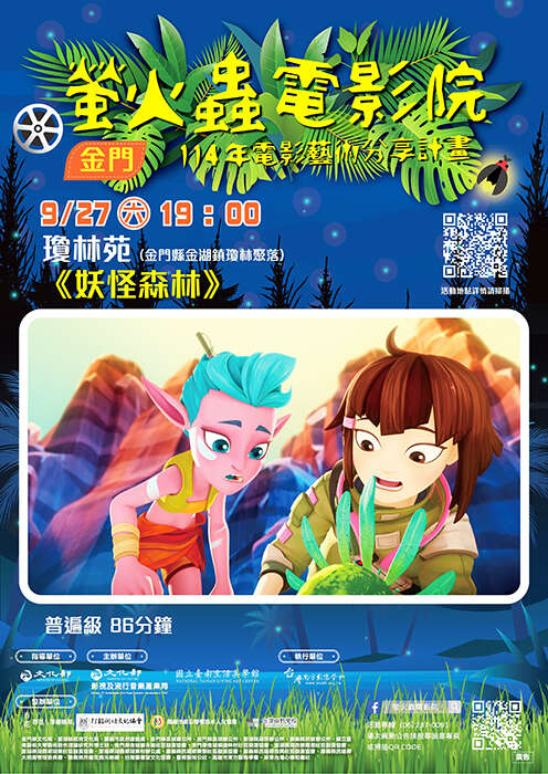 文化部所屬國立臺南生活美學館「2025螢火蟲電影院」將於9月27日(六)、28日(日)連續兩天在金門瓊林苑公園及古崗學校廣場播放動畫電影《妖怪森林》與喜劇片《導演你有病》,邀請金門鄉親一同參與兩場光影饗宴,共同支持臺灣電影發展。