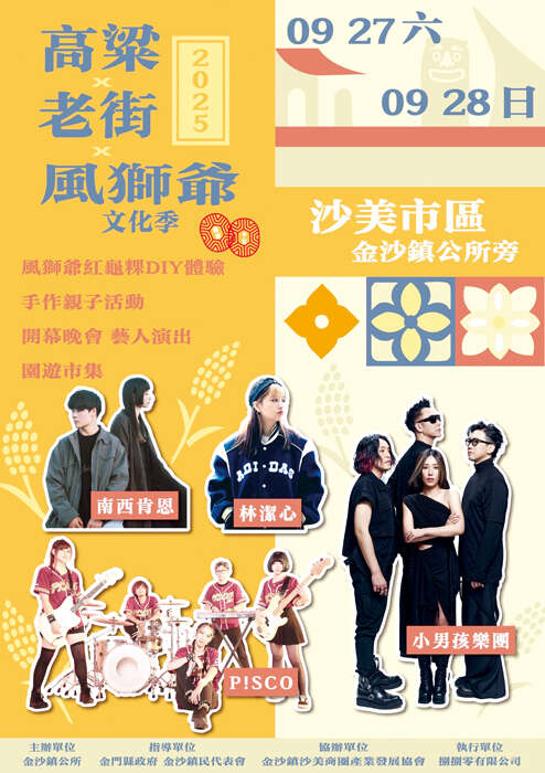 2025金沙鎮高粱老街風獅爺文化季主活動日即將於明(27)日起一連兩日上午10時起於沙美市區熱鬧舉行,首日晚間6時30分起晚會活動將登場,邀請小男孩樂團、南西肯恩、P!SCO、林潔心等帶來精彩內容。歡迎鄉親、遊客到金沙,在有趣、好玩的體驗中,感受此季節金沙人文之美。