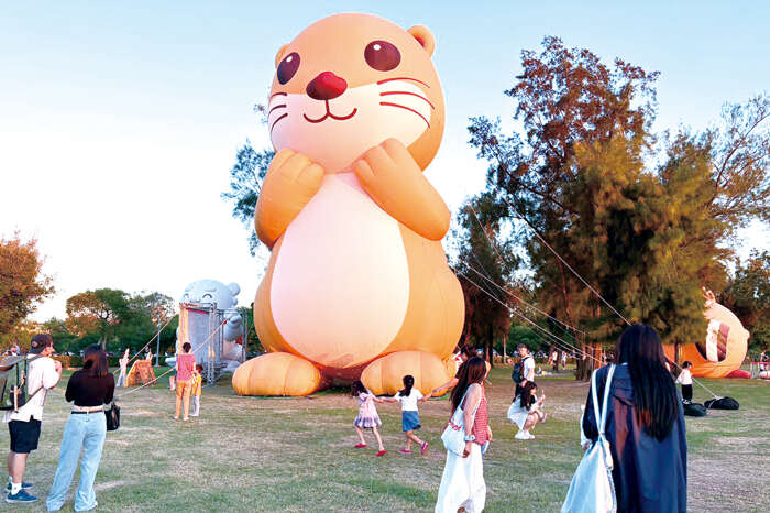 觀光處說明,三座巨型氣偶分別蘊含不同象徵意涵。14公尺高的「阿特」以歐亞水獺為原型,代表金門生態保育與親子友善的觀光精神;6公尺高的「風獅爺」象徵信仰與守護,傳達島嶼堅韌與祝福的力量;而「戴勝」則展現金門豐富的鳥類資源與自然環境之美。三者共同詮釋「自然、生態、信仰與守護」的核心價值,串連起金門文化的多元層次與生命感動。