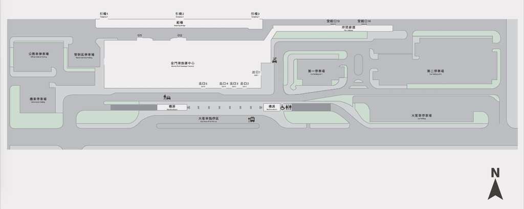 金門港旅運中心總樓層計3層,1樓規劃為抵港區域(入境區域)、3樓為離港區域(出境區域),2樓為辦公空間,旅客入境時將於1樓通關大樓辦理通關作業,出境旅客請將車輛駛上陸橋,以快速抵達3樓出境大廳。
