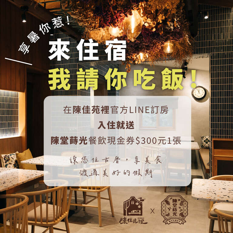 凡在陳佳苑裡官方粉絲專頁訂房成功,入住時就送電動自行車體驗,及陳堂蒔光現金抵用卷(300元)一張,讓您住古厝,享美食,逛水頭,一齊共度這難得的假期~