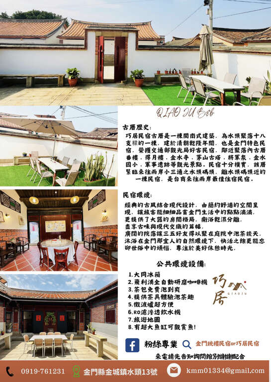 古厝的建材,均採用石磉為牆基,紅磚築牆,屋頂蓋紅瓦,因之島上傳出「有水頭富,無水頭厝」的語句,此辭句是說明了金門島上各村莊,富有的人家很多,但要在一個時間,建古厝十四間者,則罕見也。