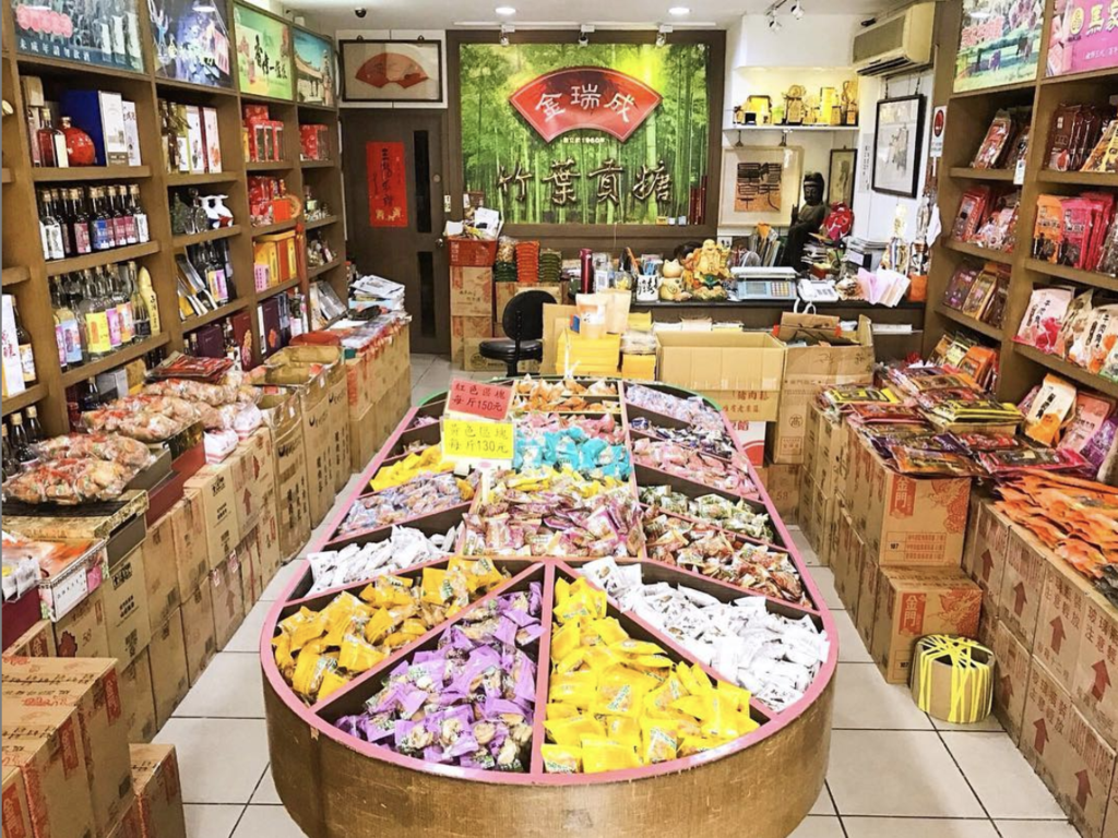 「竹葉貢糖」本店保留傳統,純手工將每塊貢糖包入竹葉裡,竹葉能防止滲油,並有特別清香之味,故名竹葉貢糖。口感特殊、清爽不膩,有原味及蒜味兩種口味。