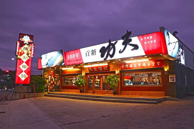 陳金福號百年傳承金門貢糖技藝,堅持手工製作並創新研發,推出多種口味貢糖與茶點,低糖不黏牙,風味獨特。特色商品包含經典花生「牙齒糖」、創意「子彈餅」、加高粱酒風味的「酒釀豆腐乳」,以及鹹蛋黃搭配蝦肉製成的「火爆肉蝦餅」,還可現場觀看製作與試吃,深受旅客喜愛。