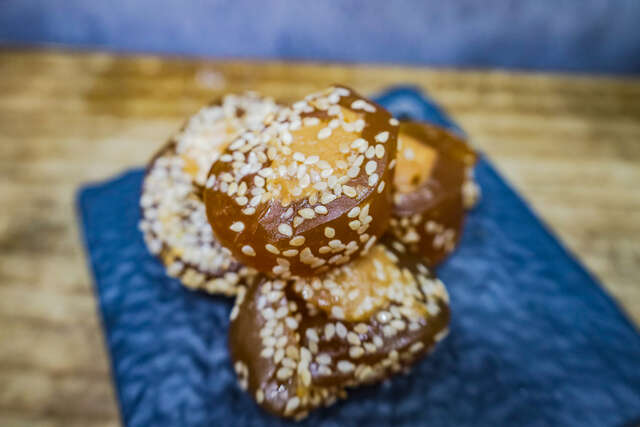 為了研發出健康、低糖、不添加其他化學合成物及無防腐劑、又不失香氣口感的配方,老闆花了無數原料、反覆調整比例,只為找出最平衡的那一味。他每天親自進廚房,從熬糖、拌料到切塊,每一道工序都不假他人之手,只要其中有一絲不如預期,哪怕只是火候不穩、口感稍偏,他也寧可整鍋報廢重來,絕不讓「差強人意」的貢糖流入顧客手中。