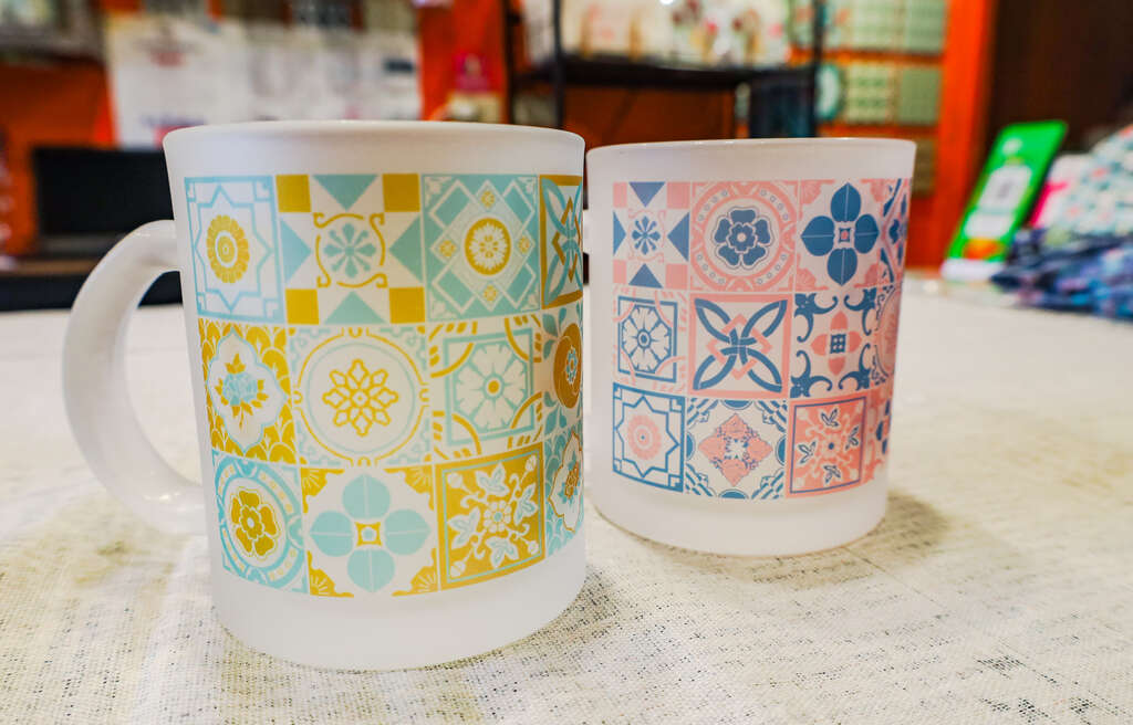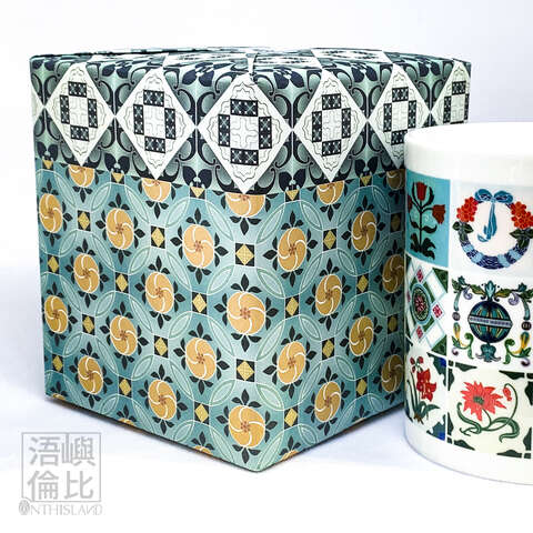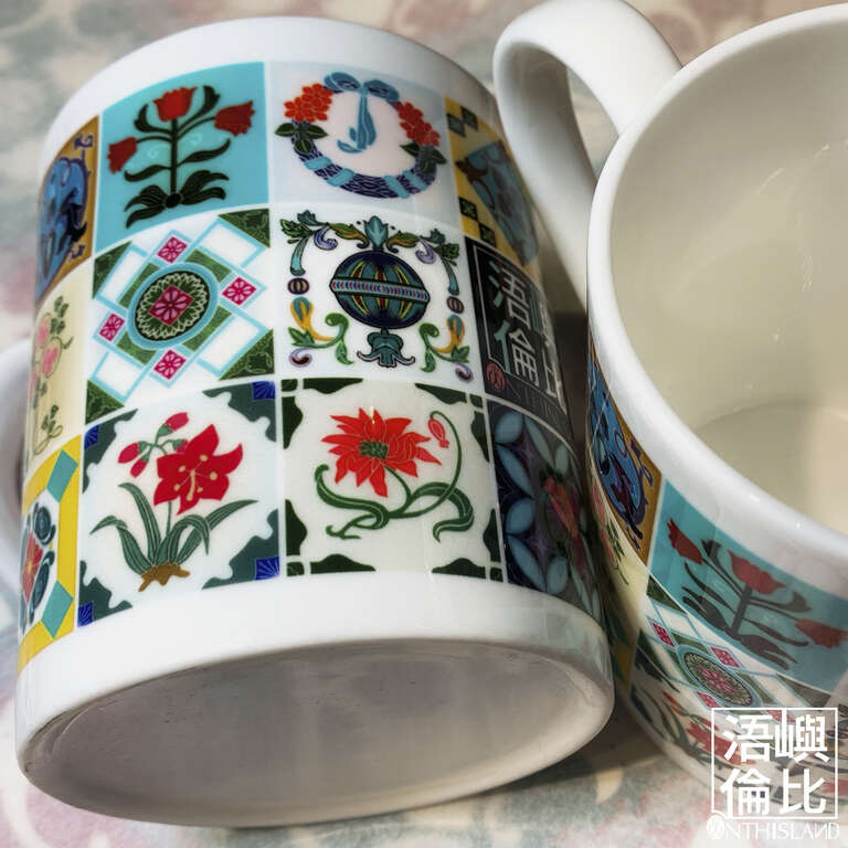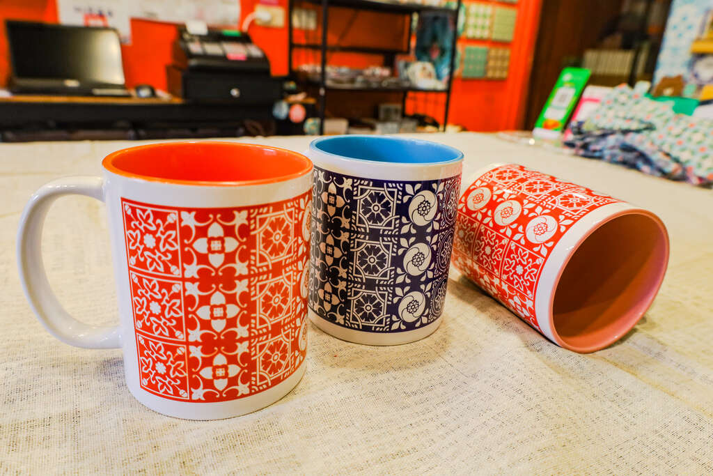 馬克杯系列|將花磚圖樣以「剪影」的方式分別以三種色彩印製,與杯子內緣顏色融合成一體。