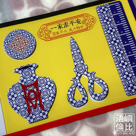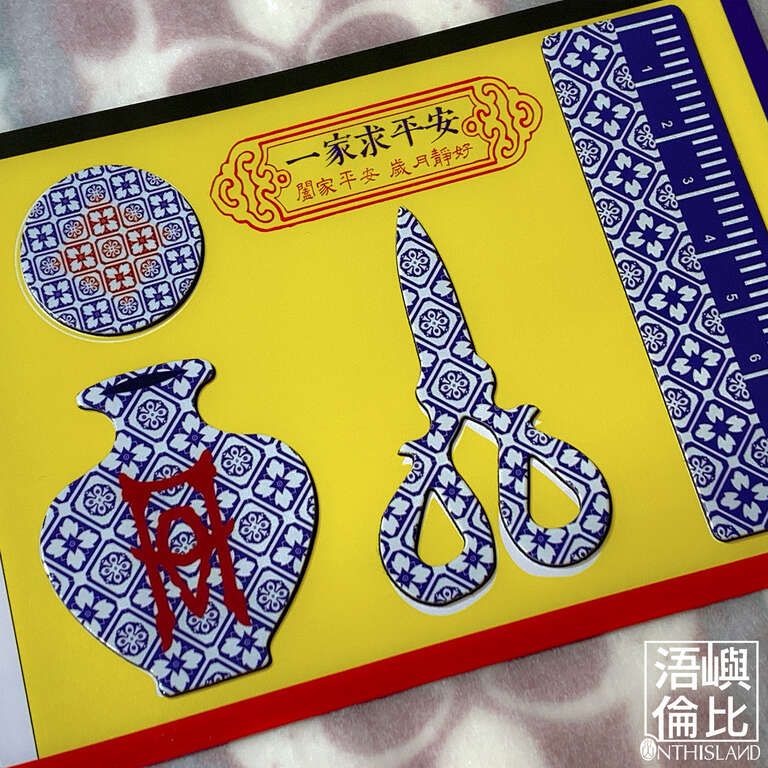 軟磁鐵組(青花釉裡紅系列)|造型創意源自於廟祠之中的民俗辟邪物《剪刀尺鏡符》,用於家宅則意為「一家求平安」。