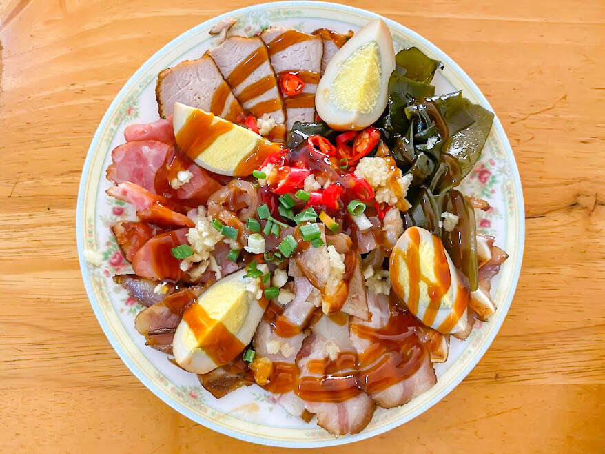「滷味拼盤」各式滷菜,上頭鋪上蔥花、蒜末以及辣椒,淋上一圈醬油膏,視覺效果十足