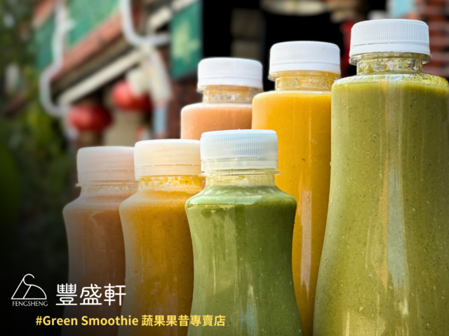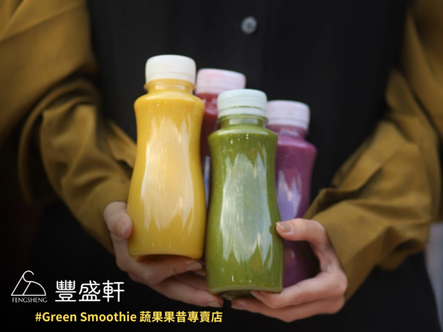 每日推出不同品項的果昔,大多以顏色及蔬果名稱命名,像是最常見也最熱賣的「四季綠」,是以綠花椰菜、地瓜葉等蔬菜為基調所調製。果昔的繽紛色彩都是源自蔬果的天然顏色.品嘗到的甜味也是來自水果本身的天然風味,豐盛軒強調飲品絕不添加糖、咖啡因、奶製品、色素,讓大家享受最純粹的滋味、最健康的品飲體驗。