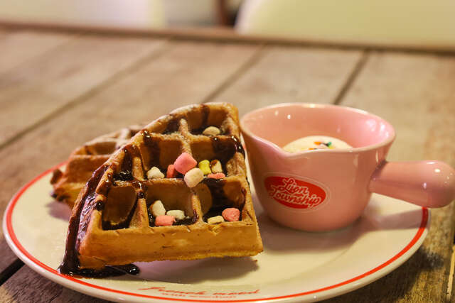 「閃電鬆餅」 這款鬆餅外酥內軟,搭配濃郁冰淇淋,口感恰到好處。取名「閃電」,希望顧客能像閃電般快速享用,避免鬆餅冷卻硬化,影響口感。鬆餅採用純奶油和牛奶製作,完全不加水,口感濃郁,香氣四溢。經過減糖處理,讓口感更加順滑,不會過於膩口。